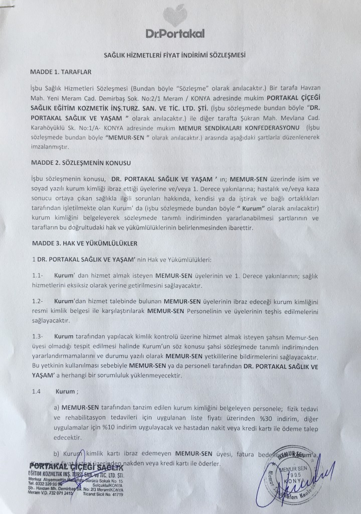 Özel Dr. Portakal Sağlıklı Yaşam Merkezi ile Memur-Sen İl Başkanlığının yapmış olduğu özel indirimli anlaşma protokolü sözleşme metninde açıklanmıştır.