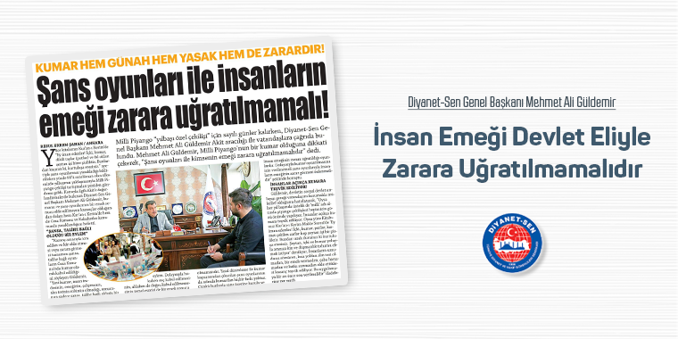 Yılbaşının yaklaşması ile Milli Piyango yine tartışılmaya başlandı. Konuyla ilgili değerlendirmelerde bulunan Diyanet-Sen Genel Başkanı Mehmet Ali Güldemir, Kumar’ın ve şans oyunlarının bir emek sonucu elde edilmeyen kazançlar olduğundan dolayı hem Kur’an-ı Kerim’de hem de Ceza Kanunu ve Kabahatler kanununda yasaklandığını belirterek “Kazanç amacıyla icra edilen ve kar elde etmesi veya zarara girmesi tamamen şansa, talihe bağlı oyunlar Ceza Kanunu’nda kumar olarak kabul ediliyor. Yani kumar, insan iradesinin, emeğinin, çalışmanın, alın terinin rolünün olmadığı, sonucunun sadece şansa, talihe bağlı olduğu bir eylem. Dolayısıyla hukuken suç kabul edilmesinin, ahlaken de doğru kabul edilmemesinin temel esprisi de bir emek sonucu olmamasıdır. Devlet eliyle yasal düzenleme ile kumar kapsamından çıkarılan şans oyunlarının da aslında kumardan hiçbir farkı yoktur. Çünkü bunlarda şans üzerine kurulu ve insan emeğinin zarara uğratıldığı oyunlardır. Dolayısıyla ne devlet eliyle ne de devlet kontrolünde kumar oynatılmasına izin verilmemeli şans oyunlarıyla insanların emeğinin zarar görmesi önlenmelidir” dedi.