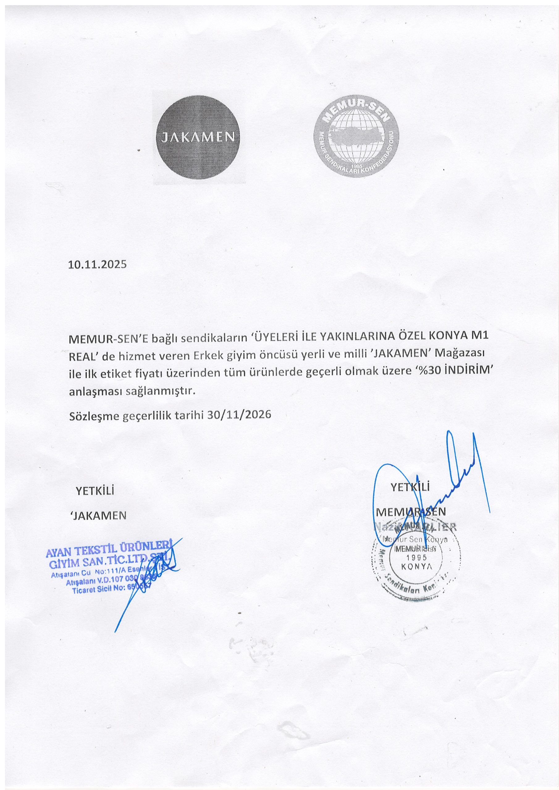 Memur-Sen Konya İl Başkanlığı ile Jakamen Erkek Giyim Mağazası özel protokol yaparak sendika üyelerine özel %30 indirimli alışveriş yapma imkanı sunuyor.