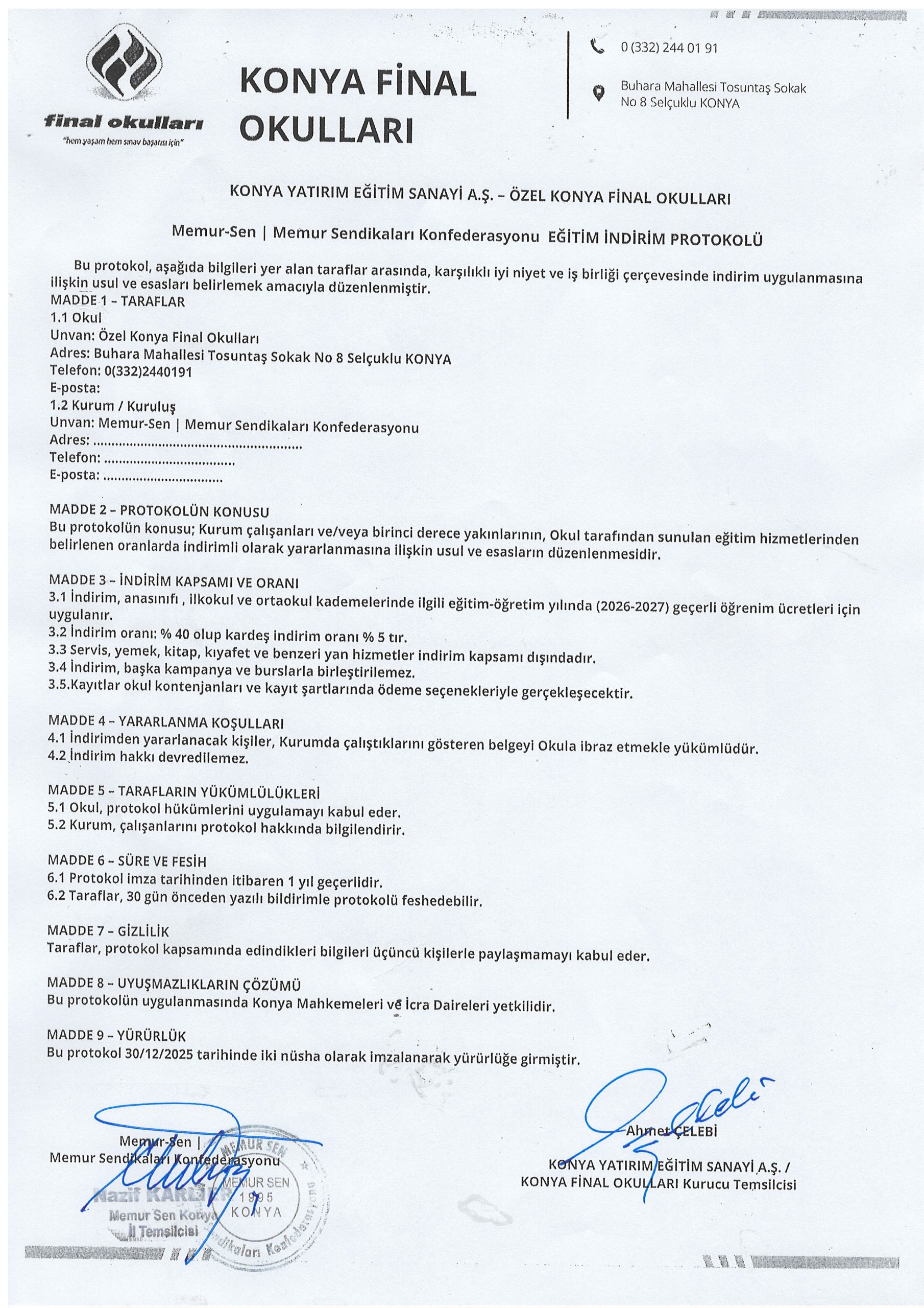 Özel Final Okulları ile Memur-Sen Konya İl Başkanlığı %40 özel indirimli eğitim ve öğretim hizmet sözleşmesi protokolü imzalandı.
