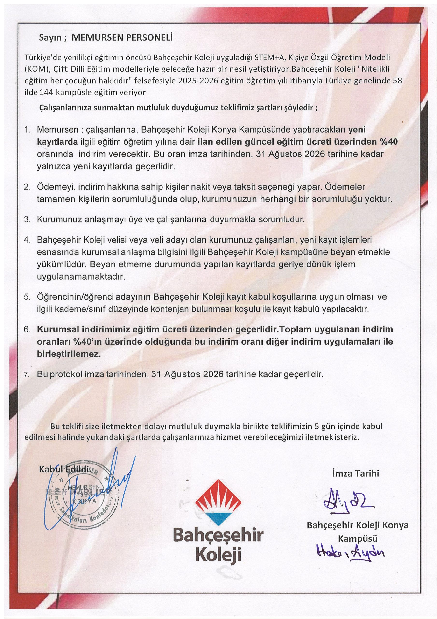 Özel Bahçeşehir Koleji (Anasınıfı, İlkokul, Ortaokul, Anadolu ve Fen Lisesi) ile Memur-Sen Konya İl Başkanlığı %40 özel indirimli eğitim ve öğretim hizmet sözleşmesi protokolünü imzaladı.