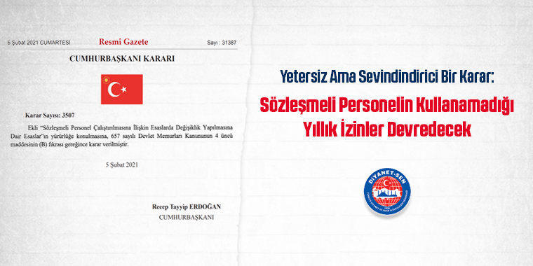Memur-Sen ve Diyanet-Sen’in 4/B’li personelin kadroya geçirilmesi ile ilgili çalışmaları devam ederken 3507 sayılı Cumhurbaşkanı kararı ile sözleşmeli personelin kullanmadıkları yıllık izinleri bir sonraki yıl kullanabileceklerine dair karar bu gün Resmi Gazete’de yayımlandı.